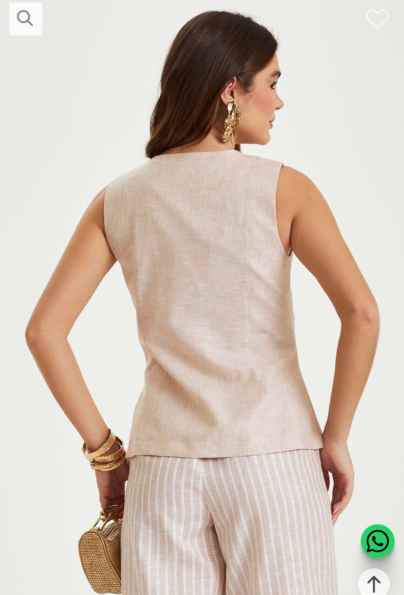 A blusa Gisele traz a sofisticação da alfaiataria em um modelo de colete cavado, com decote V alongado e fechamento frontal com botões dourados texturizados. Seu design é minimalista e elegante, com fendas delicadas nas laterais, perfeita para composições modernas que transitam entre o casual chic e o sofisticado.