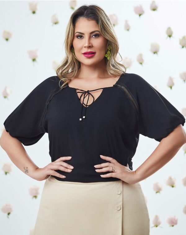 Blusa Michele é a escolha perfeita para quem busca se destacar na multidão. Blusa plus size com detalhe no decote e com guipir no colo. Com sua composição em viscose na cor preta, esse produto é ótimo no caimento e movimento.