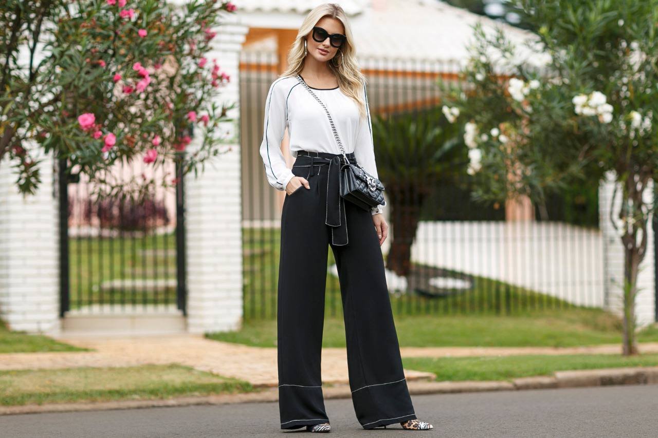 Blusa na cor caramelo de manga longa com detalhes de recorte preto no decote e mangas, decote drapeado. Tecido crepe.